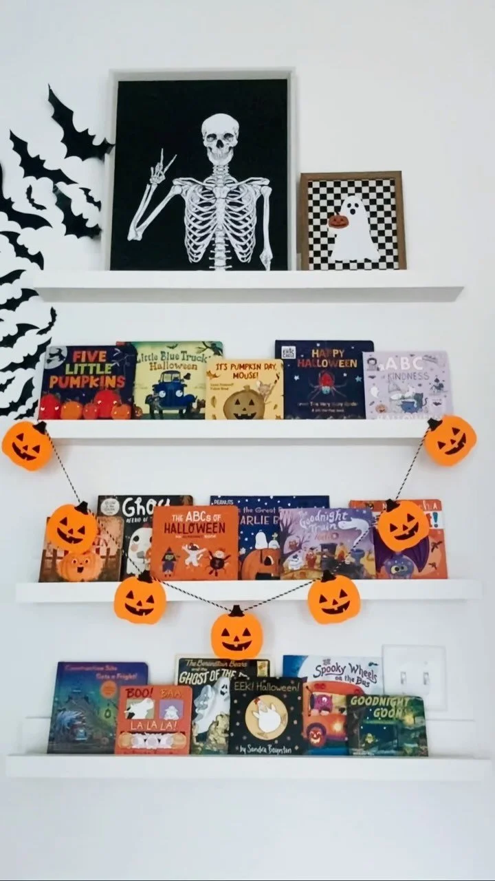 I built these floating ledge shelves in my oldest son’s room when I was pregnant with him for the sole purpose of housing his books. I have started collecting seasonal kids’ books and at the beginning of each season I transform this little corner of my son's room into a reading nook with all the books of the season. From now through Halloween these are the books we’re going to rotate through reading at night! My kids are still a bit too young to fully understand the concept of Halloween and that these books are related to Halloween, but it makes it a little more fun for my husband and I and helps us get into any holiday spirit, plus it makes a cute little decorated corner of the house for any season!!